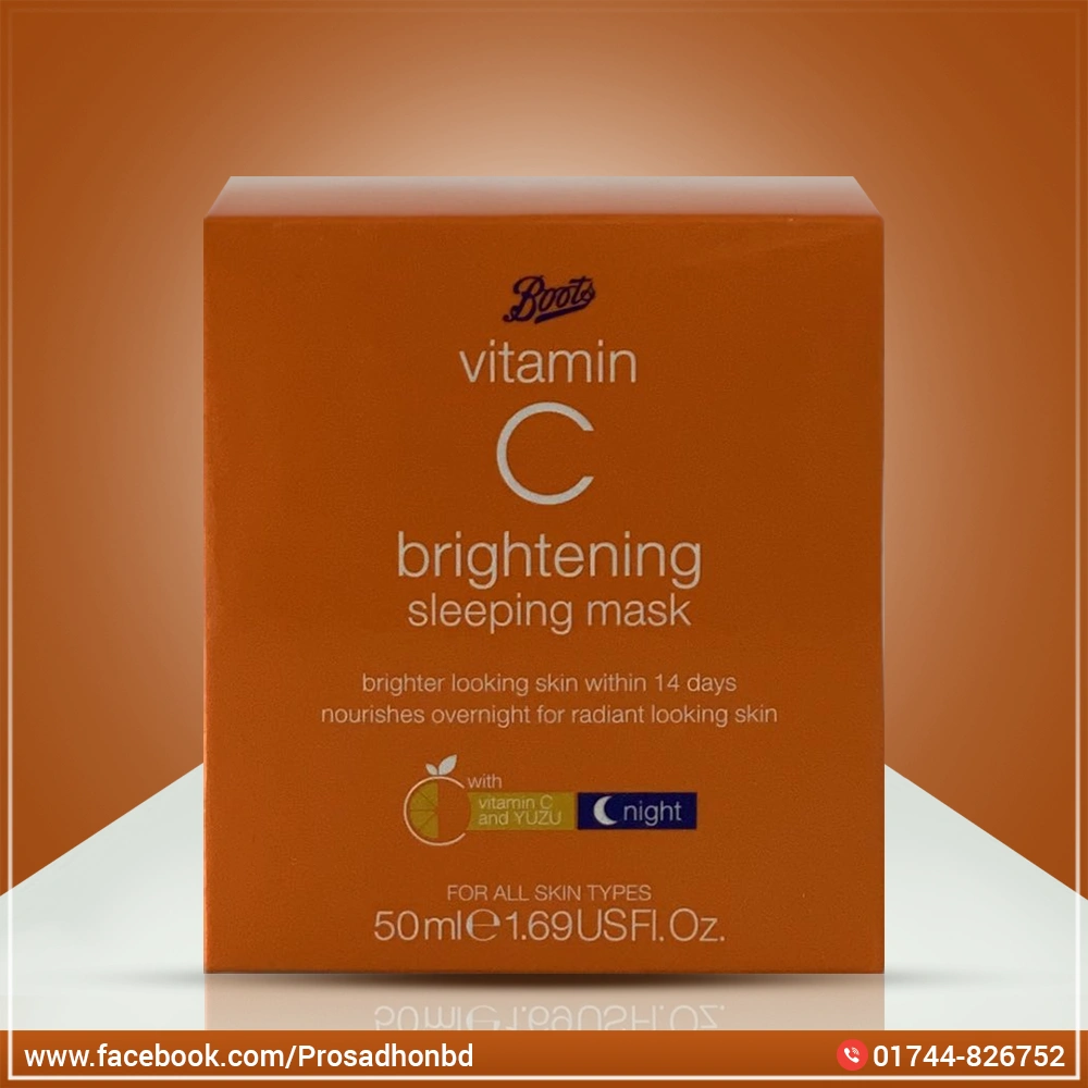 Product Description: Boots vitamin C brighetning sleeping mask promises to give you brighter looking skin in 14 days. Our Vitamin C mask nourishes skin overnight for radiant looking skin. With added Vitamin C and YUZU extract this overnight mask is suitable for all skin types.