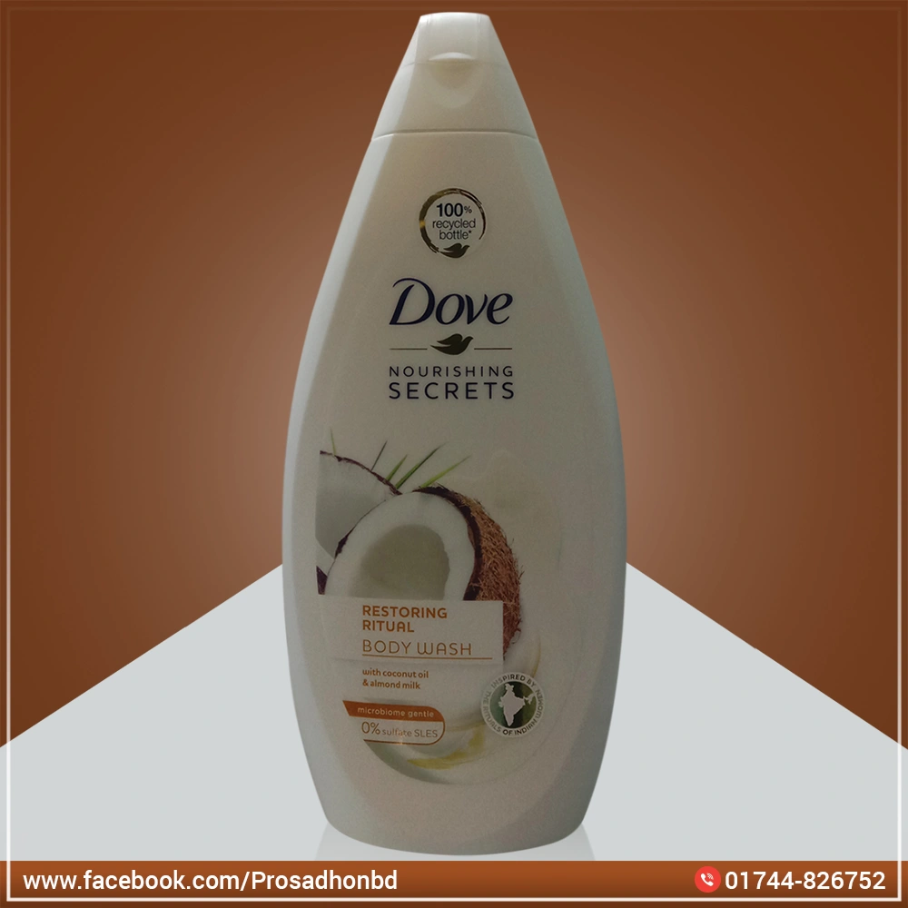 Product Description: Dove Restoring Ritual Body Wash combines coconut oil and almond milk in a creamy, nutrient-rich blend that will turn your shower into a rewarding act of care, leaving your skin softer and smoother after one shower.