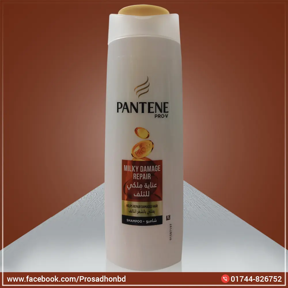 Product Description: Pantene Pro-V Milky Damage Repair shampoo, specially designed for damaged and dry hair. Its gentle, but deeply nourishing cleansing formula with milky lotion, locks moisture inside each hair strand to help repair styling-induced damage and protect your hair from recurring moisture loss. It also works to make it more resistant to styling-related damage in the future, leaving your hair smoother and healthier-looking. For best results, use with Pantene Pro-V Milky Damage Repair conditioner and hair treatments.